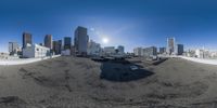 Panoramic view of San Francisco's cityscape, captured with a fisheye lens. The urban landscape is bathed in sunlight, casting hard shadows on the asphalt surface of the parking lot. Clear blue skies complete the picture.