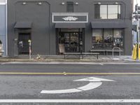 A sunny day in San Francisco, showcasing the city's classic architecture and urban infrastructure. Yellow lines mark the road surface and lead to a bustling cafe. A crosswalk and parked vehicles line the curb.