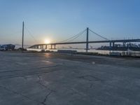 A stunning view of the iconic Golden Gate Bridge in San Francisco during the evening. The bridge stands tall and majestic, connecting the city with the rugged coastal landscape. The sun is visible, casting a warm and sunny glow on the city and the surrounding water.