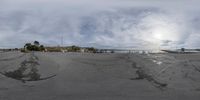 a fish eye lens image of a parking lot and ocean front in a city area