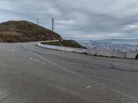 A view of a suburban road in San Francisco at dawn. The road curves through a low residential area, lined with Armco barriers. The grey sky adds a moody touch to the overview of this rural California scene.
