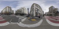 A 360-degree view of a busy street in downtown San Francisco. Classic architecture blends with modern infrastructure in this vibrant metropolis. Cars and pedestrians navigate the yellow and red painted road, while the grey sky adds a touch of atmosphere.