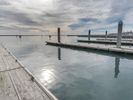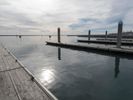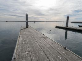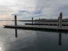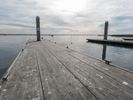 Panoramic view of the San Francisco harbor with boats docked on a pier. The grey sky adds a dramatic touch to the serene landscape. Wooden floor and boat ramp complete the rural scene.