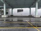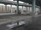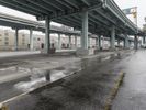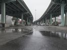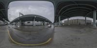 A fisheye view of a highway tunnel in San Francisco, with people walking on it. The urban landscape is reflected on the wet surface. The concrete bridge and steel columns create a striking architectural profile.