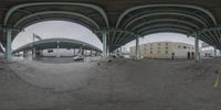 a city scene looking up at a highway tunnel with people on it in view taken through some fisheye