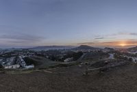 the view from top of a hill at sunset, overlooking a small city below mountains