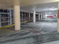 A night view of a concrete street in the city of San Francisco, USA. The street is illuminated by artificial lights, and the curve of the road leads towards a parking garage entrance. The highway ramp can be seen in the distance, adding to the urban atmosphere.