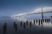 A calm night in San Francisco, with the city skyline reflecting off the coastal water. The fog creates an ethereal atmosphere, with artificial lights glowing from the skyscrapers. A perfect representation of city life.