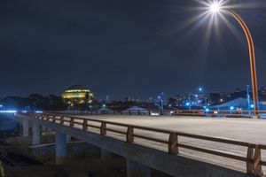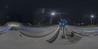 A skate park in San Francisco with ramps and lights, illuminated against the night sky. The urban infrastructure, including the road and street lights, creates a vibrant and dynamic atmosphere.
