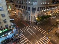 A high aerial view of San Francisco's classic architecture and urban landscape. The city lights illuminate the night, creating an open space of artificial light. Cars pass by on the elevated roads, while pedestrians cross the street below.