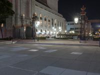 A night view of a classic architecture hotel in San Francisco, California. The city street is illuminated by street lights and the open space is filled with artificial light. A perfect spot for tourists to enjoy the urban atmosphere.