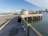 a pier and a white light on a partly clear day of day time with buildings in the background