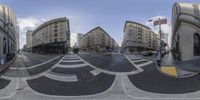 A fisheye view of a bustling intersection in a residential area of San Francisco. Classic architecture and vibrant red awnings line the streets. Pedestrians cross at the zebra crossing, while vehicles navigate the wet road surface.