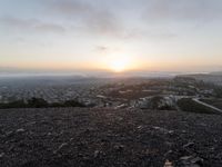 This is a photo taken at dawn from an open space in San Francisco, California, USA. The image captures the beautiful view of the city skyline with the sun visible in the sky. The surface in the foreground is covered in gravel, adding texture to the shot. The photo provides an overview of the cityscape, showcasing the recreational opportunities available. The clear sky and sunshine create a vibrant and inviting atmosphere. This photo represents the stunning sunrise in San Francisco.