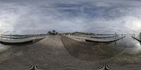 several small boats docked on a long wooden pier beside the water of a lake under a cloudy sky