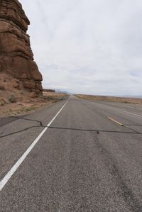 This is an image of a road in the San Rafael Swell region of Utah, USA. The road is surrounded by desert landscapes, with red rock formations and cliffs on either side. The grey sky adds to the natural environment, creating a moody atmosphere. The road surface is made of asphalt and sand, blending seamlessly with the surrounding terrain. This photo captures the rugged beauty of the Utah Badlands and is perfect for showcasing the unique geology of the region. Ideal for travel and nature-related projects.
