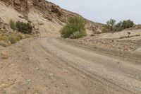 A gloomy day in the desert of San Rafael Swell, Utah. The red rock landscape is covered with a layer of dirt and sand, creating a brown, gloomy atmosphere. Off road tracks lead through canyonlands and mountain slopes.