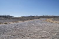 A dirt road winding through the stunning landscape of the San Rafael Swell in Utah, USA. The road surface is a mix of gravel and dirt, surrounded by red rock formations and grass surfaces. Clear blue skies complete the picturesque scene.