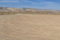 there is a field of sand with mountains in the background and a light blue sky above