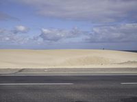 A scenic view of Fuerteventura, Spain. The coastal road winds through a vast desert landscape, with sand dunes stretching towards the horizon. The blue ocean contrasts with the sandy plain, creating a picturesque natural environment.
