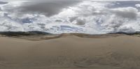 a desert with a cloudy sky and few clouds above it with some mountains in the background