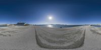 A stunning fisheye panorama of a sandy beach with a sun rise over distant mountains. The clear sky and calm ocean create a serene and picturesque landscape. This natural environment is located in Lisbon, Portugal, in the beautiful continent of Europe.
