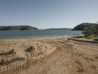 A stunning coastal landscape featuring a small sandy beach by the water. The sandy shore extends to the peaceful ocean, creating an inviting open space for relaxation and recreation. The day is clear with a clear sky and the natural surroundings of trees, highlands, and hills add to the beauty of the scene. The lake nearby reflects the vibrant vegetation, enhancing the tranquil ambiance of this serene beach. Enjoy the refreshing water resources and take in the scenic view of the bank and terrain. This stock photo perfectly captures the essence of a peaceful day at a sandy beach.
