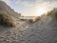 there is a trail on this sand dune near the ocean at sunset, leading to the beach with some grass and mountains in the distance