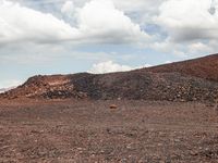 A rugged dirt road winds through a sandy landscape, surrounded by mountains and open spaces. The brown tints and shades of the mountain landforms contrast with the cloud-filled sky. Off-road track leading to a plateau with gravel and bedrock formations.