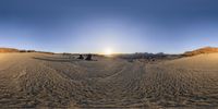 At dawn in the desert of Tenerife, three people walk along a sandy road. The stunning landscape features mountain ranges, coastal cliffs, and an open expanse of sand. The clear sky and warm sunlight create a breathtaking winter scene.