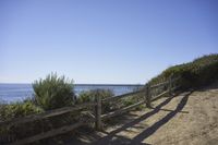 a fence and wooden rail on a dirt pathway next to the ocean beach and pier
