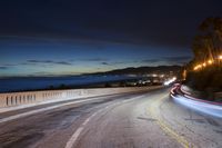 A long exposure photo of traffic on the Pacific Coast Highway in Santa Monica, California at night. The artificial light illuminates the coastal landscape with a beautiful view of the horizon and the ocean. The road surface glows with emotional colors.