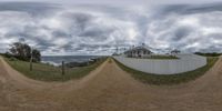 a person riding a skateboard down a dirt road under a cloudy sky with sea and white houses behind it