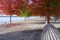 This beautiful stock photo captures the vibrant autumn colors of Ontario, Canada. The image showcases a picturesque view of the Toronto skyline in the background, with a serene lake surrounded by lush green vegetation and trees in the foreground. The clear blue sky with fluffy white clouds adds to the tranquil ambiance of the scene. The image also features a tree branch with deciduous leaves and woody plants along the shoreline. The vibrant red leaves on the grassy ground and the curbs create a colorful contrast against the natural landscape. This stunning photo is perfect for illustrating the beauty of nature during the autumn season in Ontario, Canada.