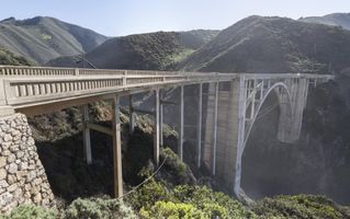 A breathtaking 360-degree view of the scenic California coast. The iconic Bixby Creek Bridge spans the ocean, surrounded by majestic cliffs. The clear sky and sunshine enhance the beauty of this elevated Pacific Coast Highway.
