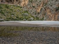 Scenic landscape in Majorca, Spain, showcasing a rock wall overlooking an open space. The Balearic Islands offer a day of exploration in the canyon. Natural dirt and gravel surfaces define the European terrain.