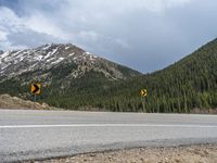 a mountain side with a road running next to the mountains, a bike parked in front of it and trees on one side