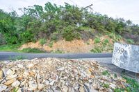 This stunning stock photo captures a scenic dawn landscape in California, USA. Rocks are piled to be used as a road construction area along a highway, with an asphalt sign at the end. The majestic mountains in the background add to the beauty of the landscape. The image showcases a perfect day with a clear blue sky and untouched nature. The profile of the road and the mountains create a breathtaking view that will enhance any project.
