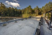 This stock photo showcases a picturesque dirt road surrounded by lush vegetation and tall trees on a sunny day. Next to the road, there are quaint wooden benches, perfect for taking in the serene landscape. The road surface appears to be a mix of dirt and asphalt. In the distance, you can spot a bridge and a fence. The vibrant yellow colors of the trees, coupled with the clear blue sky and fluffy white clouds, create a visually stunning scene. The photo was taken in Ontario, Canada, near the city of Toronto. The image also features an Armco barrier and guardrails, ensuring the safety of travelers. The concrete street leads towards the elevated lake, generating a sense of peacefulness and tranquility. The play of light and shadows adds depth and texture to the photo, making it an ideal choice for various design projects.