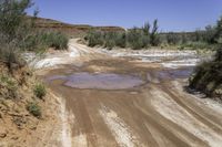 This mesmerizing stock photo captures a scenic dirt road in the breathtaking Valley of the Gods in Utah. The photo showcases a muddy road surrounded by brush-covered mountains, with trees and bushes creating a picturesque landscape. As the road curves ahead, it encounters a water hole, demonstrating the abundance of water resources in the area. The clear sky above perfectly complements the red rock formations, creating a rugged and captivating scene. Nature enthusiasts will appreciate the diversity of vegetation and fluvial landforms of streams, making this photo a valuable addition to any collection that highlights the beauty of the USA's canyonlands and its stunning natural surroundings.