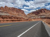A scenic drive along Highway 12 in Capitol Reef, Utah. The road winds through breathtaking landscapes, with clear skies and fluffy clouds. Nature at its finest.