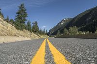 A scenic view of a winding mountain road in British Columbia, Canada. The road is lined with lush green grass and tall trees. The clear sky above is decorated with scattered clouds and contrails. Armco barriers provide safety along the road. A stunning landscape in Lillooet.