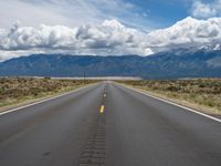 an open empty highway in the middle of the mountains with blue skies and fluffy white clouds