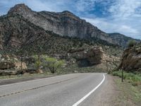 A road stretches into the distance, cutting through the picturesque Utah mountain landscape. Clear skies above highlight the beauty of the asphalt road. Enjoy a scenic drive in this part of the USA.