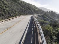 This is an image of a coastal road in California, USA. The road winds along the coastline, with the ocean visible on one side and mountains on the other. The asphalt road surface is lined with trees, while clear skies and sunshine illuminate the landscape. In the distance, a bridge connects the two sides of the highway. This photo captures the beauty of nature and the infrastructure that allows for transportation along the Pacific Coast Highway in Big Sur, California.