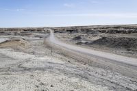 a dirt road is surrounded by some hills and desert like terrain as the vehicle sits on it