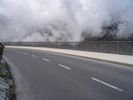 Dramatic view of an asphalt road winding through the highlands of Austria. The grey, fog-covered mountains provide a dramatic backdrop to the scenic landscape. Armco barriers line the road, ensuring safe travel. A perfect day for exploring nature.