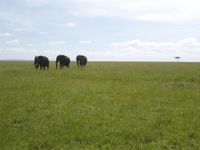 Scenic landscape of a wide green field, ideal for recreational activities. The open grass surface extends to the horizon, reminiscent of rural plains and prairies. Four elephants graze peacefully against a backdrop of trees and a sunny blue sky.