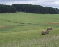 Scenic landscape of an open field, with two sheep grazing on a grassy hill. Cloudy skies enhance the beauty of the rural countryside. A perfect day for agriculture and enjoying the open space.
