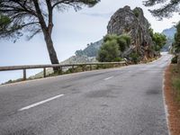 Scenic coastal road in Spain, with mountainous terrain on one side and the sparkling ocean on the other. Ride through lush vegetation and trees, while passing by rock formations and a protective barrier. A breathtaking nature landscape in the Balearic Islands.